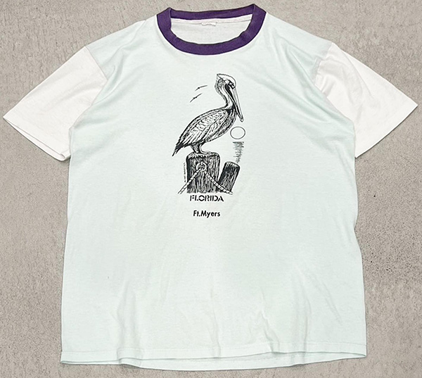 ペリカンがプリントされ、「FLORIDA Ft.Myers(フロリダ フォート・マイヤーズ)」と書かれていますが、フォート・マイヤーズのお土産品なのかカレッジTシャツなのかは不明。