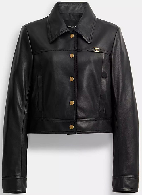柏倉椿(中条あやみ)が着ていた 黒いレザージャケット は COACH(コーチ)の ヘリテージ C スナップ フロント シュランケン ジャケット、104,500円。