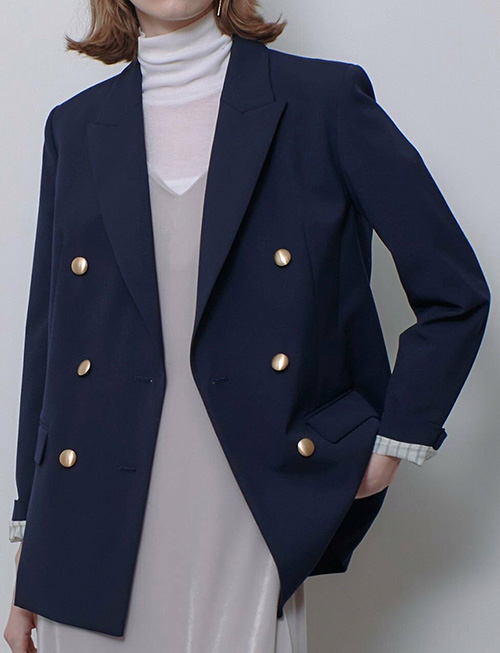 6つボタンのマニッシュなデザイン。袖の裏地はストライプ柄。