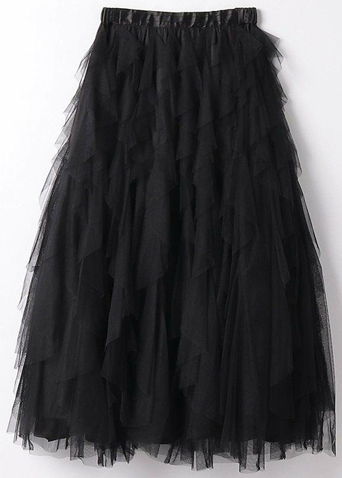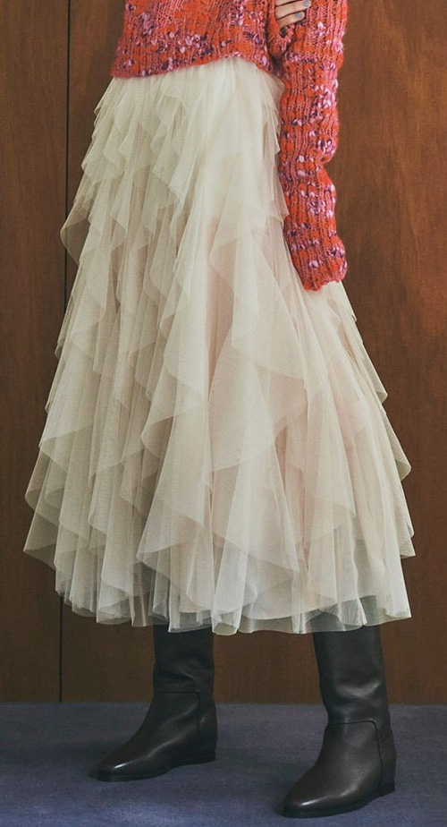 チュールをラッフル状にして縦のラインを作りボリュームを出した華やかなスカート。