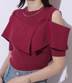 アシンメトリーなBIGカラーのオープンショルダーニット。