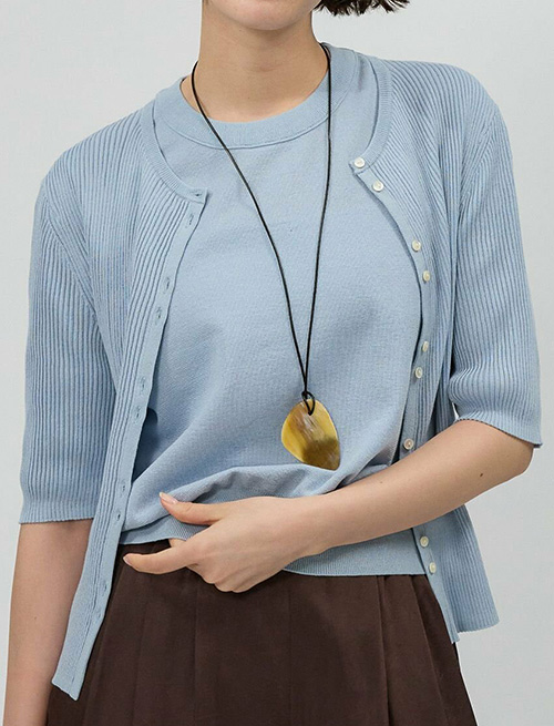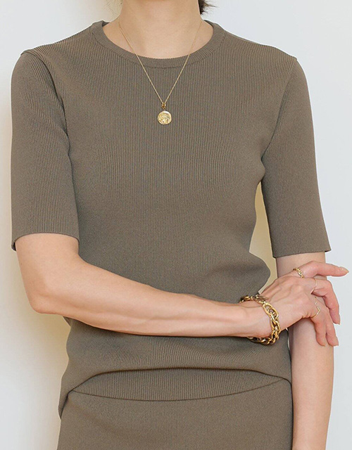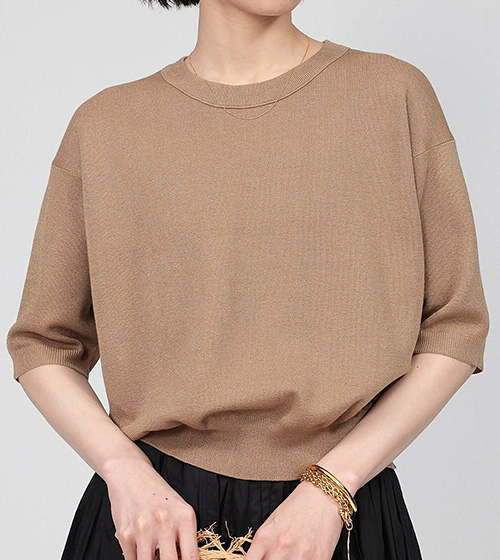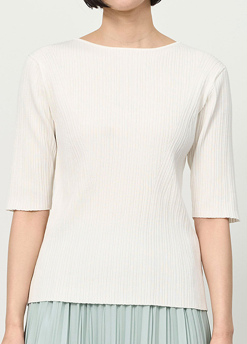ドライでシャリ感のある糸で織られたランダムリブの5分袖ニット。