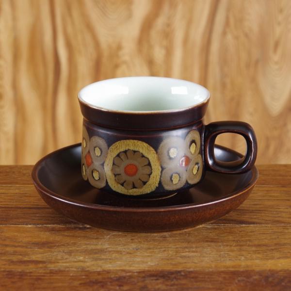 Eccleston(エクルストン)のアンティークセンターで発見した1960年代に人気を博したカップはイギリスの陶磁器メーカー Denby(デンビー)の Arabesque(アラベスク)シリーズ。ぽっちゃりした形と温かな色合いがが女性に人気。