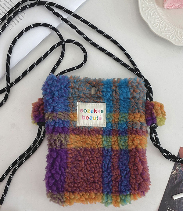 汐川颯太(天野優)が持っていた チェックのポシェット は全く同じものではないですが、sozakka beauté(ソザッカボーテ)の 2WAY アソート柄ボアファーミニショルダーバッグ/ポシェット、2,480円 が近いデザイン。