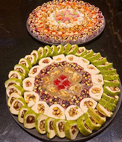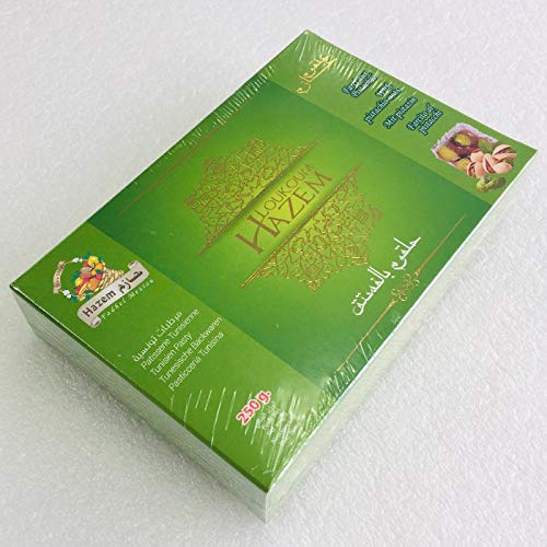 薄いフィロ生地をいく層にも重なり、生地の間にはピスタチオが挟まっていて、甘いシロップがかけられています。